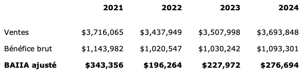L’entreprise est bien implantée dans son quartier depuis plusieurs années. Elle démontre un bel historique de rentabilité et dégage des marges supérieures à la moyenne de l’industrie.